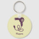 Crea un pequeño regalo personalizado para tu peluquero favorito. Esta cadena de claves está lista para ser personalizada con un nombre u otro texto en letras de guión y cuenta con un ilustracion de estilo retro de un secador de pelo o un secador de pelo en color morado oscuro contra un fondo de color crema.