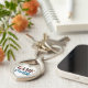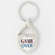 Silver keychain with "Game Over" text in bold, colorful letters, attached to keys. Positioned on a table near an orange flower, notebook, and smartphone.