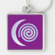 Graded, silvery crescent moon accompanied by a spiral pinwheel of light, on a deep purple evening sky background