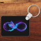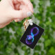 Símbolo de infinito violeta y brillante con colibrí azul sobre fondo negro. Neón.
