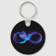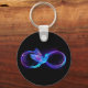 Símbolo de infinito violeta y brillante con colibrí azul sobre fondo negro. Neón.