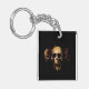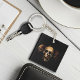 Tres cráneos humanos en el fondo de negro. Un pequeño criador está mirando por el cráneo medio