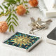 Sol dorado con personalización inicial sobre fondo de vidrio manchado.