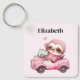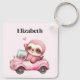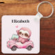 Un llavero con un ilustracion caprichoso. Un perezoso rosa conduciendo en un descapotable rosa. Adorable.
