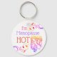 ¡Estoy tan caliente! ¡Y la menopausia es un vapor de bonito! Muéstrale a todos tu lado del par con esta cadena de claves. Presenta una primicia de chica de Alphonse Mucha, enmarcada con un pergamino victoriano, y dice "Estoy menopausia caliente". Colores de color rosa claro, violeta, rojo y amarillo sobre un fondo blanco.