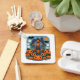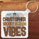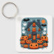 Ready for some spooky vibes with this fun Halloween keychain. On the front is an illustration of a haunted house with bright orange kawaii pumpkins in the garden. Flying around are cute bats and ghosts and i round orange moon. On the back is the text 'Spooky Season Vibes' and a template to add your name to personalize, Ideal for a Halloween treat or just some spooky fun.