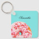 Esta muestra un donut con espolvoreo rosa claro y rociado en cadenas de llaves