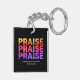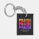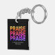 Elegante PRAISE Music Notes Christian Keychain diseñado con las palabras PRAISE PRAISE PRAISE PRAISE en una tipografía en negrita y colorida que también incluye coloridos staves musicales y notas en las letras. Debajo hay un TEXTO de PERSONALIZABLE que dice DEJAR TODO LO QUE HAYA RESPIRADO AL SEÑOR, que se basa en el verso de la Biblia cristiana del Salmo 150. El diseño se repite al revés. Esta Keychain cristiana de elogios sería ideal para músicos y fieles. Puedes agregar tu propio texto, o nombre de tu iglesia o banda, etc