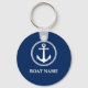 Una cadena de claves con temática náutica personalizada con el nombre de tu barco, el apellido u otro texto deseado. Este diseño único cuenta con un ancla de barco vintage de fabricación personalizado con emblema de círculo de diamante en blanco sobre un fondo de azul marino clásico. Si es necesario, el color de fondo se puede personalizar fácilmente para que coincida con la decoración actual. Hace un gran regalo en cualquier ocasión para ese super capitán, capitán o marinero.