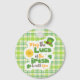 Esta cadena de claves festiva presenta la imagen de texto "Que la suerte de los irlandeses esté contigo" con gorras irlandeses, monedas y champis en un fondo verde de felpa.