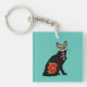 Un gato negro con el día del cráneo de azúcar muerto maquillando por su cuenta un telón de fondo verde azulado.