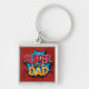 Super Dad Mustache Modern Grunge Keychain presenta el texto "Super Dad" en la tipografía moderna de color rojo y amarillo sobre un fondo de color azul y gris rojo acentuado con un bigote. Regalos para papá por cumpleaños, Día del Padre, Navidades, vacaciones y más. Creado por Evco Studio www.zazzle.com/store/evcostudio