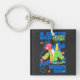 The design features a stylized, happy couple in a modern flat illustration style, dressed in bright pink, blue, and green with playful patterns like yellow floral trousers. The composition is bursting with whimsical abstract elements, including green scribbles, red stars, and bubbly cloud shapes. The bold blue typography is split across the top and bottom, creating a balanced and high-energy visual.