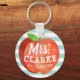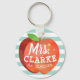 A fun and lighthearted seafoam green striped keychain featuring a stylized apple illustration. Inside of this apple is your favorite teacher's name in a playful style font.