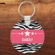 Moderno y moderno Sassy Star Zebra Keychain con un fondo de moda de cebra en blanco y negro y un atrevido borde magenta adornado con un divertido motivo estrella. Este diseño ondulado puede ser personalizado con el texto personalizado de su elección. Haga clic en "Personalizar" para encontrar más opciones de personalización.