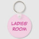 Cadena de teclas de la habitación de las damas con un texto rosa oscuro sobre un fondo rosado. La cadena de llaves de la habitación de los hombres está disponible.