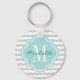 Teclas de patrón de chevron gris verde azulado monogramadas. Cadena personalizada de llave de zag en zig gris con elegante logotipo de quatrefoil. Cadena de teclas de botón redondo personalizado para mujeres y chicas adolescentes. Diseño de banda de zigzag preppy con letra inicial con nombre de monograma y tipografía de escritura elegante. Un favor de la fiesta nupcial, una ducha de novia o una idea de regalo de cumpleaños. Color del fondo del personalizable. Cambie la cantidad para obtener el precio más barato al por mayor. Accesorios de moda para ella.