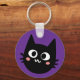 Funny cadena de teclas moradas con un cómico gato negro personalizado con ojos grandes redondos y mejillas rosadas rosadas en un estilo de dibujo de dibujos de doodle. Esta cadena de claves está diseñada con tus datos de contacto en la parte posterior con un mensaje que indica que tienes un gato esperando en casa.