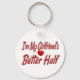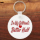Keychain con yo soy mejor la mitad de mi novia en un texto rojo 3D.