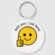 Cara amarilla redonda divertida. Tiene dos puntos negros para los ojos y una sonrisa feliz. Él está dando la señal de los pulgares hacia arriba con su mano. Sobre su cabeza hay una plantilla para agregar su propio texto.