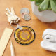 Endless Knot Buddhist design with yellow and orange circular grunge strokes with Om Mani Padme Hum in elegant surrounding text. In the inner brown circle is larger Om Mani Padme Hum text. In the center with a backing of enlightened rays is an Endless Knot symbol, one of the Eight Auspicious Symbols of Buddhism.
