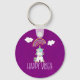 Keychain con un lindo ilustracion de un unicornio blanco sentado sobre su bulto sonriendo y luciendo feliz. Nubes sonrientes y un arcoiris sobre el cielo. El texto dice: Feliz Vibes. Adorable imagen edificante. Está situado sobre un fondo de color morado rosado.