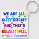 Cita inspiradora de "Todos somos DIFERENTES y eso es BELLO" con singulares rompecabezas de autismo, y coloridas mariposas volando en el fondo para apoyar y defender la conciencia del autismo.