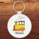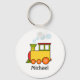Tren multicolor lindo en amarillo, rojo, verde y naranja. Las bocanadas de vapor acolchado azul están saliendo de la chimenea. Debajo hay una plantilla para agregar su nombre para personalizar esta cadena de claves.