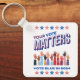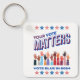 El colorido keychain de las elecciones fiestas demócratas de 2024 presenta diversas manos levantadas con el texto "tus asuntos de voto" y "Vota azul en 2024".