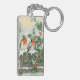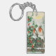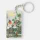 Vintage Christmas illustration of two little robins sitting on a fence with holly berries in the snow.