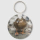 Esta impresionante cadena de teclas muestra una fotografía de un hermoso pato marrón con un pico naranja brillante. El pato está parado en una pared que da a un lago y parece que está muy pensado.