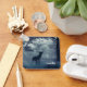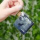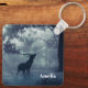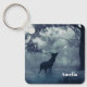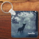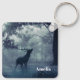 Cadena de llaves con una foto de un venado de regal con corderos parados en un bosque sombrío entre árboles iluminados por el sol. Nieve por todas partes.