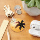 Viaje de ilustracion vintage e imagen de transporte con un avión volando sobre una silueta de una palmera y un pequeño mapa de Hawaii y las Islas Hawái. El cielo es un hermoso color naranja con la puesta de sol.