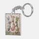 Decorative Print Keychain featuring vintage Easter bunnies in quilted patchwork print design. Three adorable fabric-style rabbits with Easter egg basket printed image. Cottage core shabby chic aesthetic. Nostalgic vintage charm print.