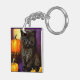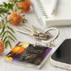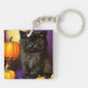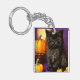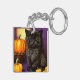 ¡Keychain con un gatito vintage de Halloween! Un gatito negro esponjoso posa junto a las calabazas sobre un fondo morado. ¡Un regalo divertido para las fiestas de Halloween y para los amantes del gato!