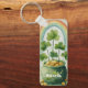 A keychain with a seasonal St. Patrick's Day image. Faded grunge style paper. A green pot of gold with coins