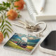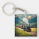 Este llavero cuenta con un vintage tren de vapor contra una majestuosa panorámica de la montaña.
