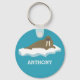 Crea un regalo personalizado genial. Este llavero tiene un ilustracion de una morsa flotando sobre un trozo de hielo o un iceberg. El ilustracion de estilo realista de la morsa es marrón, con un fondo azul turquesa. Está listo para ser personalizado con un nombre u otro texto debajo del gráfico con letras blancas.