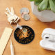 Orange and black Halloween scene illustration incorporating a silhouette of a church graveyard with gravestones, bats flying out of the belfry against a ghostly moon, a black cat on the roof and a spider and web hanging from a bare tree. Customise with your own text and font as a treat for yourself or a valued family member to make them feel special. Great for autumn and Halloween season.
