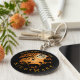 Orange and black Halloween scene illustration incorporating a silhouette of a church graveyard with gravestones, bats flying out of the belfry against a ghostly moon, a black cat on the roof and a spider and web hanging from a bare tree. Customise with your own text and font as a treat for yourself or a valued family member to make them feel special. Great for autumn and Halloween season.
