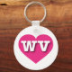 Esta cadena de claves presenta un corazón rosa vibrante y conmovedor que contiene las letras atrevidas, blancas y fundas superiores WV, la abreviatura oficial de Virginia Occidental, el estado montañoso.