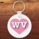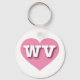 Este llavero presenta un fresco corazón rosado que contiene las letras atrevidas, blancas y altas del funda WV, la abreviatura oficial de Virginia Occidental, el estado montañoso.