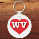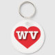 Este llavero presenta un vibrante corazón rojo que contiene las letras atrevidas, blancas y fundas superiores WV, la abreviatura oficial de Virginia Occidental, el estado montañoso.