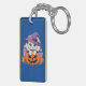 Un gato blanco con un gorra de brujas sentado en una calabaza de Halloween rodeado de velas.
