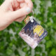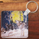 Una imagen de un lobo gritando en la luna con la manada de lobos cercana honra esta hermosa cadena de llaves. Artista internacional Jo-Ann Hayden