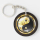 Joyería, oro y símbolo yin yang negro sobre fondo negro. Oro yin yang.