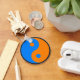 Yin Yang Keychain. Este keychain está decorado con un símbolo de Yin Yang azul y naranja. "En la filosofía taoísta, el yin y el yang surgen juntos de una quietud inicial o vacío y siguen moviéndose en tándem hasta que se vuelva a alcanzar la quietud. Por ejemplo, colocar una piedra en una piscina de agua tranquila elevará simultáneamente las olas y los bordes inferiores entre ellas, y esta alternancia de puntos altos y bajos en el agua irradia hacia afuera hasta que el movimiento se disipe y la piscina vuelva a estar tranquila. Yin-yang, por lo tanto, siempre tiene cualidades opuestas e iguales. Además, cada vez que una calidad alcanza su punto máximo, naturalmente comenzará a transformarse en la calidad opuesta: el grano que alcance su altura completa en verano (yang) producirá semillas y morirá en invierno (plenamente yin) en un ciclo interminable" - Wikipedia. Una gran idea de regalo.