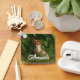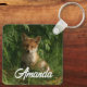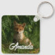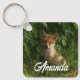 Un llavero con una fotografía que muestra un lindo zorro bebé de piel roja y blanca. Rodeado de hojas y hierbas verdes.