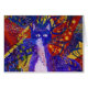 Un gatito púrpura del smoking se sienta con sus patas dobladas cuidadosamente. Detrás de él rojo, los remiendos amarillos, anaranjados, azules y verdes del color forman un fondo delicioso y vivo. Flashes de la raya de las cales, del carmesí, ambarina y violeta a través de la pintura. Los triángulos, los puntos, las rayas y los círculos estrallan con la fiesta de la entrada de las pecas en cielo. Los rasgones de la lavanda y del añil se vierten para su paso, aunque hay mucha alegría en su llegada.