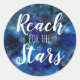 Enséñale a los niños que el cielo es el límite con estos pegatinas que presentan tipografía de estilo de escritura a mano "Alcance para las Estrellas" en un fondo de galaxia azul girado.